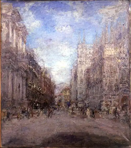 He made his debut at the 4th Esposizione Triennale di Brera in 1900 with two landscape studies and began to participate regularly in the exhibitions held at the Famiglia Artistica Milanese and the Società per le Belle Arti ed Esposizione Permanente, becoming established on the art scene in 1906 through his participation in the Esposizione Internazionale di Milano. From the 1920s on, he distinguished himself as a protagonist in the Milanese cultural coteries, being one of the leading lights of the Associazione degli Acquarellisti Lombardi and of the Famiglia Artistica Milanese, and he was awarded a gold medal at the exhibition devoted to the Lombard landscape in 1926. From the outset his cityscapes and landscapes are characterised by broken brushstrokes and a light, transparent palette, which was to become his signature style. In the 1940s, when he took up painting again after the long hiatus due to World War II, he reprised his repertoire of Milanese and Venetian views, which had now become repetitive and conventional, using a looser and more fluid pictorial technique.