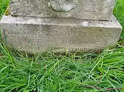 She was buried at Brompton Cemetery in London[25] wearing her black and leopard skin finery and a pair of false eyelashes. She was also interred with one of her beloved stuffed pekinese dogs.[24] Her tombstone is a small grave marker in the shape of an urn draped in cloth with a swag of flowers to the front. The inscription on the tombstone, which misspells her "Louisa" rather than "Luisa", is inscribed with the quote, "Age cannot wither her, nor custom stale her infinite variety", from Shakespeare's Antony and Cleopatra.
