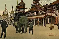 Dundy was in charge of raising capital for the project, while Thompson was responsible for the park's layout and architecture.[9] The Brooklyn Daily Eagle initially estimated that Thompson and Dundy would spend $200,000 renovating Sea Lion Park.[13] Ultimately, the men spent $700,000 (although they advertised it as $1 million) totally rebuilding the park and expanding its attractions.[17][18] Wall Street financiers and Coney Island speculators each contributed half the project's cost.[9] By November 1902, Thompson aimed to open the park by May 2 of the following year.[19] Topsy the elephant, which Boyton had bought that season to add to the menagerie of animals at Sea Lion Park, was involved in demolishing some of the old rides. During an October event that involved Topsy hauling the airship Luna from Steeplechase to its new location, handler William Alt was arrested for disorderly conduct after assaulting the elephant with a pitchfork and then turning it loose to wander down Surf Avenue.[20][21] In an organized publicity stunt, Thompson and Dundy announced they would hang Topsy and sell tickets to the event.[20] Following an intervention from the Society for the Prevention of Cruelty to Animals, Thompson and Dundy agreed to a more humane method of poisoning, electrocuting, and strangling the elephant in a smaller private affair that was captured in the short film Electrocuting an Elephant.[22] Thompson and Dundy ultimately electrocuted Topsy, then killed her using cyanide, in January 1903.[23][24]