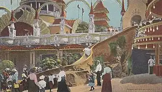 Thompson and Dundy were constantly changing the park's attractions.[49] Ahead of the 1904 season, Thompson and Dundy expanded Luna Park by 16 acres (6.5 ha),[50][51] bringing its total area to 38 acres (15 ha).[42][52] The expansion included replicas of additional locales,[53] a Japanese tea garden,[54] a replica of a Himalayan mountain above the Coney Island Creek,[55] and a $250,000 reproduction of the Delhi Durbar.[54][55] Thompson and Dundy also added several shows, including "Night and Morning" and a series of pageants hosted on a 700 ft-wide (210 m) stage.[56] A second deck was added around the central lagoon, increasing the park's capacity by 70,000.[42][51] George Kessler of the Sea Beach Land Company agreed to buy the land under Luna Park in June 1904 for over $1 million; the sale did not affect Thompson and Dundy's lease.[57][58] Kessler initially took an option on the site; he decided to exercise his option in September 1904.[59] At the time, Luna Park had already accommodated two million guests.[60]