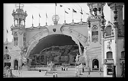 The arched entrance on Surf Avenue was described in The Street Railway magazine as "covering half of an entire city block",[226][227] with four monolithic figures, one at each of its corners.[30][31][227] The entrance gate contained five ticket kiosks, shaped like Roman chariots and staffed by "young women dressed in evening attire and Merry Widow straw hats emblazoned with red feathers".[228] A large avenue called the Court of Honor extended straight from the entrance and was surrounded by 53 buildings.[228] There was a replica of Venice to the right of the court,[31][226] which included a miniature Grand Canal with gondoliers, as well as a model of the Piazza San Marco.[228] To the left of the Court of Honor were three large buildings, which featured the Trip to the Moon, War of Worlds, and 20,000 Leagues Under the Sea attractions.[30][229] Other attractions, which housed various shows, the Grand Casino, and the Old Mill and Helter Skelter attractions, were placed alongside the Court of Honor.[38]