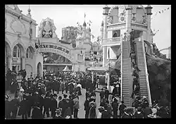Thompson and Dundy planned to add new rides including a flower garden, a German village, and a Trip to the Moon attraction.[20] The lagoon and the Shoot the Chute attraction were the only parts of Sea Lion Park to be retained.[9][10][20] Early plans called for Luna Park to include a tower with 38,000 lights.[13] The park's original rides and attractions also included an infant incubator, a Shoot the Chute ride, a three-ring circus, and a Fire and Flames show that employed over a thousand performers.[25] Luna Park unofficially opened on April 5, 1903, with a live show.[26][27] The same month, Leo Wyent and George M. Foley sued to prevent Thompson and Dundy from issuing a concession allowing a third party to sell cigars and alcoholic beverages at the park.[28] Thompson and Dundy planned to sell alcoholic beverages at one location in the park, the German Village.[26]