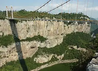 The Luojiao River Bridge is a 268 metres (879 ft) long suspension bridge in the Dafang County of Guizhou, China. The bridge forms part of China National Highway 321 between Bijie and Guiyang. As of 2012, it is among the highest bridges in the world sitting 183 metres (600 ft) above the natural river level. Three other high bridges sit along the stretch of highway between Bijie and Guiyang: the Liuguanghe Bridge, the Xixi Bridge, and the Wuxi Bridge. Construction of a dam on the river, downstream of the bridge has created a reservoir which extends under the bridge. At full pool level the clearance below the bridge is reduced to 146 metres (479 ft).