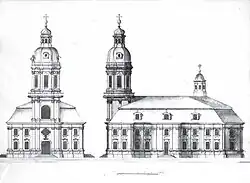 By decree of 26 December 1727, Emperor Peter II allocated land to the German Lutheran community in a deserted area near a large promising road between the current Bolshaya and Malaya Konyushennaya streets. The site was donated 'for the construction of an evangelical church, a school and a parsonage'.[2] The church building was founded on 29 June 1728, the day of the Holy Apostles Peter and Paul.[3] On 25 June 1730, on the day of the celebration of the 200th anniversary of the Augsburg Confession, the church was solemnly consecrated in the name of the apostles Peter and Paul (later the name St. Peter was more often used in documents and everyday life).[4] Stylistically, the new church building belonged to the examples of Petrine Baroque architecture characteristic of St. Petersburg in the first third of the 18th century. The building was made of brick, had a wooden turret and could accommodate 1,500 people (about a thousand below and five hundred in the choir).