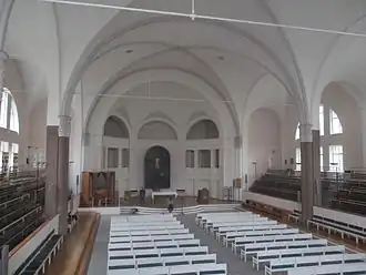 In 1895-1897, the interior of the church was radically changed according to the design of Professor Maximilian Messmacher, the largest architect of the late 19th century, a leading representative of late historicism architecture. Messmacher saw the goal of the reconstruction in bringing the interior elements to a certain stylistic unity ('... the interior of the church should have been decorated more uniformly, while Renaissance and Greek motifs should have received free and equal expression').[20] According to Messmacher's design, a new painting of the walls and vaults was created: all the architectural elements of the interior were divided into separate geometrically regular sections - panels and were maximally saturated with decor. In addition, two side entrances were installed on the sides of the main entrance to the church hall, electric lighting was installed, instead of cast iron fences, carved oak fences appeared on all tiers of galleries, and the organ choir was expanded.