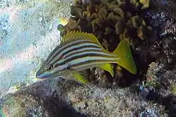 Lutjanus carponotatus has a moderately deep body which has a depth of around 2.5 times its standard length. The snout is rather pointed, with a steep dorsal profile. The knob and incision on the preoperculum are weakly developed. The vomerine teeth may be arranged in a triangular patch with a posterior extension or in a rhombus shaped patch and there is a small patch of grain like teeth on the tongue.[5] The dorsal fin contains 10 spines and 14-16 soft rays while the anal fin has 3 spines and 9 soft rays.[2] The rear part of the dorsal fin and the anal fin are rounded in shape, the pectoral fin has 15 to 17 rays and the caudal fin is emarginate. The scale rows on the back rise diagonally from the lateral line.[5] The maximum total length recorded for this species is 40 cm (16 in) although 30 cm (12 in) is more typical.[2] This species overall colour is bluish-grey to whitish and it is marked with 8-9 yellow to golden-brown horizontal stripes along the flanks, they have yellow fins and there is a blackish spot on the axil and the base of the uppermost rays of the pectoral fin. The juveniles have a wide white longitudinal stripe running from the snout to the base of the caudal fin, above and below this whitish stripe there are alternating dark brown to black stripes.[6]