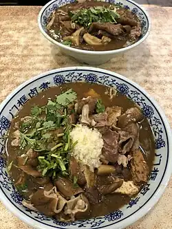 Luzhu huoshao (Chinese: 卤煮火烧; pinyin: lúzhǔ huǒshāo; lit. 'pork stew with bread') is one of the most well-known traditional Beijing street foods. Long considered a luxury, the cuisine is especially prevalent in Beijing. The main ingredients are pork, pork lung, pork intestines, pork liver, tofu, and some may add fermented bean curd or chives sauce. It is served with bing bread.[1]