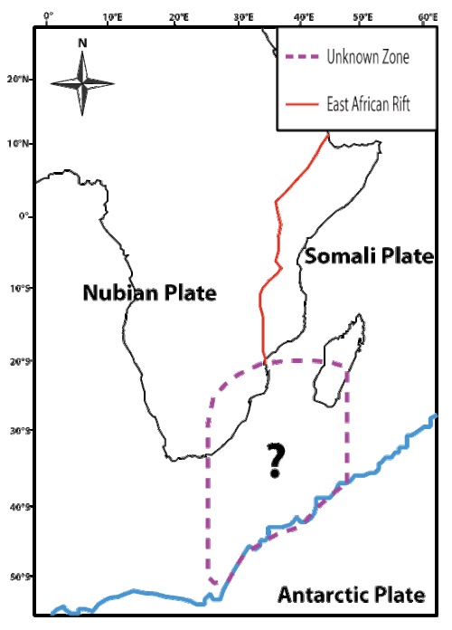 • Eastern boundary – To the east, the boundary may be more of a diffuse boundary. There are current studies trying to pinpoint the exact location of this boundary; it is believed to cut across Madagascar, making it Lwandle's only boundary that is not purely oceanic. Earthquake slip vectors are the primary constraint that predict the actual plate boundaries. Velocity predicted at this boundary is 1.3–1.4 mm/yr.[3] This boundary separates Lwandle from the Somali plate.[3]