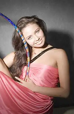 Lyasan Albertovna Utiasheva (Russian: Ляйсан Альбертовна Утяшева; Bashkir: Ләйсән Альберт ҡыҙы Үтәшева; born 28 June 1985) is a Russian socialite, television host, and former individual rhythmic gymnast. She is a two-time Grand Prix Final all-around medalist, and was an ambassador of the 2018 FIFA World Cup. Utiasheva was known for her extreme flexibility, her emphasis in point of landing on high relevé in her backsplit pivots led to a career ending injury.