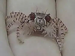 Research undertaken in 1997 by I. Karplus and others investigated how these aggressive crabs responded to other crabs of the same species in their vicinity, and whether their anemones were used as weapons in these encounters. Of the 50 crabs used in the study, 48 had two anemones each when first caught while the remaining two had just one. It was found that when two well-matched crabs met on neutral ground, much of the agonistic activity took place when the crabs were still some distance from each other, and involved threateningly extending a leg holding an anemone in the direction of the other crab. Some crabs retired from the fray at this stage but if the encounter proceeded to contact between the protagonists, the grapple was between the hindmost walking legs and the anemones were held out to the rear, well away from the contact zone. As well as aggressive moves, certain maintenance activities also took place while the crabs were close to one another. These included an individual crab rubbing its legs together or putting its mouthparts to the base of one of its anemones, but these movements also sometimes occurred when no other crab was present so were discounted as belligerent activities.[3] Three hypotheses were put forward for the non-use of anemones during encounters: