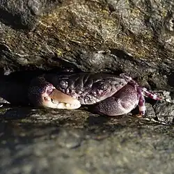 Lydia annulipes is a species of crab in the family Oziidae.[1] Coloration varies from brown to red brown to purple, with purple[2] or red brown bands[3] on the walking legs. The right claw of individuals collected has been found to be larger than the left claw.[3]