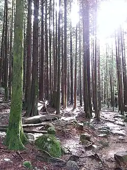 The park is covered in dense temperate rainforest that houses a wide array of organisms.[4] Like the neighbouring Lynn Canyon Park, Lynn Headwaters is a second growth forest. Cedar stumps can be seen throughout the park, reminding visitors of old logging practices. However, there remain a few scattered trees which are 600 to 700 years old and four to five meters in diameter.[5][6]