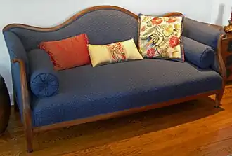 A lyre arm is an element of design in furniture, architecture and the decorative arts, wherein a shape is employed to emulate the geometry of a lyre;[1] the original design of this element is from the Classical Greek period, simply reflecting the stylistic design of the musical instrument. One of the earliest uses extant of the lyre design in the Christian era is a 6th-century AD gravestone with lyre design in double volute form.[2] In a furniture context, the design is often associated with a scrolling effect of the arms of a chair or sofa. The lyre arm design arises in many periods of furniture, including Neoclassical schools and in particular the American Federal Period and the Victorian era. Well known designers who employed this stylistic element include the noted New York City furniture designer Duncan Phyfe.[3]