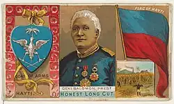 On August 18, 1879, Salomon returned to Haiti and became president with huge support from the people. His rise to power was anticipated by General Richelieu Duperval, who carried out a coup d'état on the night of October 2–3 that deposed the provisional government of Lamothe-Hérissé.[5] After the coup, another provisional government was installed, presided over by Florvil Hyppolite and composed of General Duperval, Seide Thélémaque, Tirésias Simon Sam and also Salomon, who was appointed as minister of finance and foreign affairs.[6][7] On October 23, the National Assembly elected Salomon for a seven-year term.[5] His presidential inauguration took place 3 days later, on October 26.[8] His plan as president was to restart public education, fix Haiti's financial woes, restore agriculture productivity, improve the army, and to fix the public administration. Within four months, he established the National Bank of Haiti, and by 1880 he resumed debt payments to France. The 1880s saw a huge amount of effort by the Salomon administration to bring modernization to Haiti. He adhered to the International Postal Union and issued its first postage stamp. In October, he granted a British cable company the right to connect Port-au-Prince and Kingston, Jamaica, and by 1887 he negotiated to link Môle-Saint-Nicolas to Cuba. He restructured the medical school, imported teachers from France for the Lycées, and more. The Armed Forces of Haiti were reorganized to 16,000 and assigned to 34 infantry regiments and 4 artillery regiments. Salomon also reorganized the ranking distribution in the army, which only included privates and generals.
