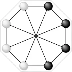 Mū tōrere is played on papa tākaro, or gameboards, or can be inscribed into clay or sand. The board is in the form of an eight-pointed star with endpoints, called kewai, connected to the center point, or pūtahi. The lines connecting the kewai to the pūtahi are oriented at 45 degrees.