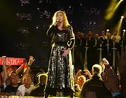 To promote the album, Madonna embarked on the MDNA Tour, which was her ninth concert tour.[10] The tour visited America, Europe and the Middle East, while also marking the singer's first performances in the United Arab Emirates, Ukraine, Scotland and Colombia.[11] Described by her as "the journey of a soul from darkness to light", the MDNA Tour was divided into four sections: Transgression, where guns and violence was the main theme, Prophecy, where a mix of joyful songs that bring people together are performed, Masculine/Feminine, a combination of sensuality and fashion with a few of Madonna's classic songs performed in a French Cabaret-style, and Redemption, which Madonna labelled as "a big party and celebration".[12] The tour received positive reviews,[13][14][15] but courted many controversial subjects such as violence, firearms, human rights, nudity and politics.[16] Nevertheless, it was a commercial success and many venues were instantly sold out.[17] After completion, it was dubbed the highest-grossing tour of 2012 by Billboard. Total gross was $305.2 million from 88 sold-out shows, becoming the tenth highest-grossing tour of all time and surpassing Celine Dion's Taking Chances World Tour as the second highest-grossing tour among female artists, behind Madonna's own Sticky & Sweet Tour.[17]