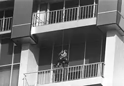 Proper evacuation of the hotel guests was also hindered as there was no automatic means of returning elevators to the main floor during a fire, causing 10 deceased victims to be found in an elevator.[16] Some hotel guests tied bedsheets together and hung them on balconies to alert first responders. Some tried using the bedsheets to descend the hotel's exterior.[8][21] Fire ladders were only able to reach the ninth-floor exterior.[22] One man escaped the hotel tower by lowering himself down a rope.[23][24]