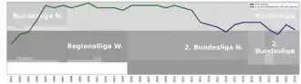 The women's football section of MSV Duisburg was founded in 2014. It is the successor club of FCR 2001 Duisburg which went into insolvency the year before. When FCR 2001 Duisburg had to file for insolvency during the 2013–14 season, nearly all players left the club and joined the MSV Duisburg. As MSV they were allowed to continue the second half of the season with the original license of the FCR. MSV Duisburg played in the second level, 2. Bundesliga. In 2015–16, winning the league championship promoted the club to the 2016–17 Bundesliga. The club remained in the top level until 2020–21. In the 2021–22 season, they returned to the Bundesliga for the 2022–23 season.[1] Following a last-place finish in the 2023–24 Bundesliga, they withdrew from the 2024–25 2. Bundesliga season.[2] The decision was made to compete in the West Regionalliga, following the relegation of the men's team to the Regionalliga and the resulting financial deficits.[3]
