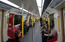 In this configuration for the South Island line (similar to that of Alstom Metropolis), the pantograph is situated on the end cars (A car), while all three cars will have a motor each (no trailer cars). Like the converted M-Trains used on the Disneyland Resort line, these trains are fully automated, but unlike the DRL trains, the driver's cab has been replaced by extra passenger space, with an unobstructed view out the front windows (similar to that of the HKIA automated people mover). However, each train has at least one staff for patrol in the traffic hour who are able to control the train manually to comply with requirements from the Fire Services Department.[14] The trains feature a different interior compared to the Kwun Tong Line configuration as well as a different paint scheme and headlight styling. Designed in sixteen months, all ten three-car trains are now in service.