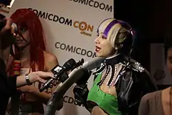 Greek MTV journalists interviewing a cosplayer at the Comicdom 2012 comics convention in Athens, Greece