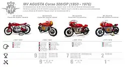 The MV Agusta 500cc road racers were motorcycles that the manufacturer MV Agusta built and which were used to compete in 500cc Grand Prix motorcycle racing series between 1950 and 1976. 18 500cc world championship titles were achieved with these machines ridden by John Surtees, Gary Hocking, Mike Hailwood, Giacomo Agostini and Phil Read between 1958 and 1974.