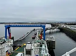 The Ardrossan harbour development plan was supported by the taskforce, and in April 2018 Humza Yousaf gave the project the go-ahead.[87] In April 2020 CMAL awarded a contract for design and installation of LNG bunkering facilities at Ardrossan and Uig.[88] The plan was for Ardrossan harbour's Irish Berth to be the primary dock during two years of construction, with Troon as a temporary back-up.[89][90] In 2021, Troon was chosen as the primary dock during the works, and preparations there began in May.[91][92] During tender design work, the scope of works at Ardrossan expanded, including re-alignment of the Arran berth. On 14 August 2023 the Minister for Transport, Fiona Hyslop, announced a pause to obtain a refreshed business case and cost exercise by Transport Scotland.[93][94] Peel took the view that increased costs should primarily be borne by the Scottish Government and North Ayrshire Council.[95]
