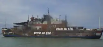 The ship had a total of four decks. Up to 170 cars or 30 trucks could be accommodated on the first deck, and 30 cars on the second deck. There was room for 350 passengers on the third deck, while crews and control systems were located on the fourth deck.[1]