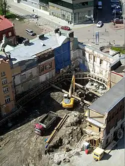 The street space is dominated by the renovated or restored Art Nouveau buildings, including the longest Art Nouveau façade in Tallinn designed by Baltic German architect Jacques Rosenbaum.[4] Viewed from a distance, the combination of the 'new and old' gives an impression that the modern glass facade of the office tower is growing out of the historic sections.[7]