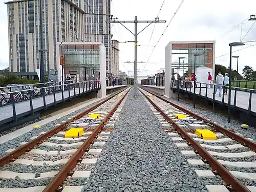 Steendijkpolder is a metro station on Line B of the Rotterdam Metro located in Maassluis, South Holland. The station entered regular service on 30 September 2019.[1] Although it is located on the former Hoekse Lijn, converted from a railway, this is the only station of the line which never was a railway station and was constructed in 2019, when the railway was converted into rapid transit. Steendijkpolder consists of a side platform for westbound services toward Hook of Holland, and an island platform used by eastbound services toward Nesselande.