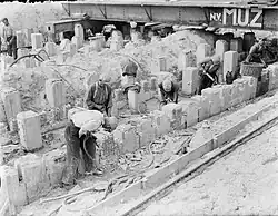 The first project undertaken by the MUZ was the construction of the Pilot Polder at Andijk (Dutch: Proefpolder Andijk). On 17 September 1927, a competitor organisation known as the Society for Contracting Zuiderzee Works (Dutch: Maatschappij tot Aanneming van Zuiderzeewerken, MAZ) was founded. The MAZ was established by N.V. Maatschappij tot Aanneming van Werken, owned by A.L.J. (Leendert) Volker of Bussum, and Johannes Kraaijeveld of Sliedrecht, with the company later becoming Boskalis.[3] This consortium was based in Anna Paulowna, with its first project being the construction of a dike around the Boezemmeer south of Wieringen.[7]