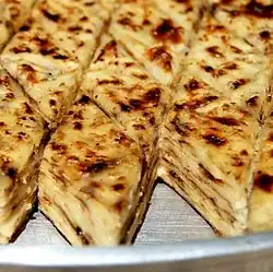 Ǵomleze prepared on a tray. Gjomleze is typically cut into diamond-shaped pieces