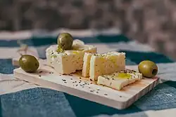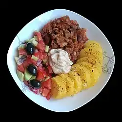 Macedonian cuisine (Macedonian: Македонска кујна, romanizedMakedonska kujna) is the traditional cuisine of North Macedonia. It is influenced by Ottoman and Balkan cuisines.[1] The relatively warm climate of the country provides excellent growth conditions for a variety of vegetables, herbs and fruits. Macedonian cuisine is also noted for the diversity and quality of its dairy products, wines, and local alcoholic beverages, such as rakija. Tavče gravče and mastika are considered the national dish and drink of North Macedonia.[2][3]
