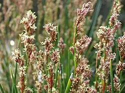 The robust grass-like sedge is rhizomatous and perennial, it typically grows to a height of 4 metres (13.1 ft) and a width of 2 m (6.6 ft). It blooms between August and March producing brown flowers.[5] It has rigid, terete and biconvex culms that are smooth and glabrous. The culms are 20 to 110 centimetres (0.7 to 3.6 ft) in length and 1 to 5 millimetres (0.04 to 0.20 in) in diameter. The narrow and erect inflorescence has an interrupted-oblong shape in outline forming dense clusters that are around 7 to 20 cm (2.8 to 7.9 in) long and with a diameter of 1 to 2.5 cm (0.39 to 0.98 in). After flowering an ellipsoid to obovoid shaped pale red-brown to bright orange coloured nut. The nut is smooth with a hispid apex with a length of 2.2 to 4 mm (0.09 to 0.16 in) and a diameter of 1.2 to 2 mm (0.05 to 0.08 in).[6]