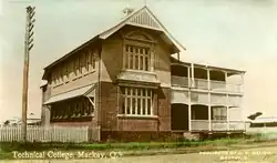 The Mackay Technical College building was one of a number of similar buildings constructed for technical colleges around the state at this time. These technical colleges were constructed in Rockhampton, Warwick, Toowoomba and Mount Morgan. They were generally established without the direct involvement of the government, being run by local committees. As in Mackay, architectural plans and specifications were supplied by the government, along with funds for construction, but administratively, the technical colleges remained autonomous.[1]