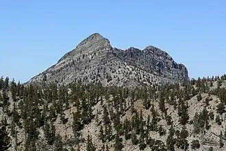 Macks Peak is part of the Spring Mountains which are a subrange of the Great Basin Ranges. The peak is located 30 miles (48 km) northwest of Las Vegas in the Mount Charleston Wilderness, on land managed by the Humboldt–Toiyabe National Forest.[2] Topographic relief is significant as the summit rises nearly 1,900 feet (580 meters) above Macks Canyon in one mile (1.6 km). This mountain's toponym has not been officially adopted by the U.S. Board on Geographic Names, however Macks Canyon has been.[4]