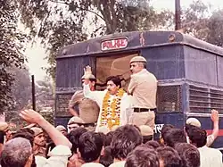 In college, due to his "domineering nature", older students and teachers started to refer to him as Bhaiya or Bhaiya Ji (lit. 'brother') instead of his birth name.[8] This stuck, and during the 1989 Uttar Pradesh Legislative Assembly election he contested as Madan Bhaiya for the first time, unsuccessfully running for the Khekada Assembly constituency of Baghpat while being lodged in jail.[9] To register under the name, he had to furnish an affidavit of name change before filing his candidate nomination for the election.[8]