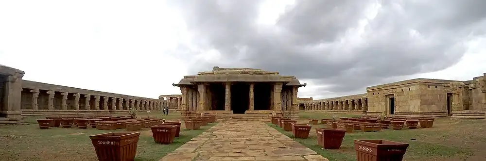 The mukha-mandapa is a slightly rectangular hall measuring 11.18 m X 9.14 m. It has finely carved pillars with lotus corbels at the centre; a stone slab with female figures dancing as a group; brackets with vyala figures; and line drawings (including those of lion, lotus flowers, and monkeys). Its doorways feature dvara-palakas and Gaja-Lakshmi, and the ceiling has a lotus medallion.[7]