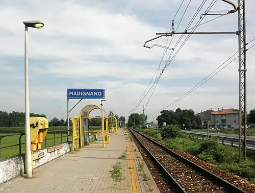 When the Treviglio–Cremona line was being constructed in the early 1860s, among the approximately 50 municipalities whose territories would have been affected by the infrastructure, only four assumed a hostile attitude to the development. Among these was Madignano, which had just suffered heavy burdens from the construction of an oratory (already abandoned by 1856) and a new road to neighboring Castelleone.[2] The railway nevertheless reached the comune in 1862 without any station being built.[3]