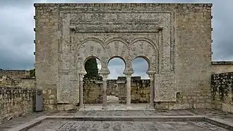 The building was richly decorated. The doorways, some rectangular and some arched, were framed with geometric and vegetal (arabesque) decoration, and the floors were paved with geometric patterns. The exterior façade of the building, which faced south over the edge of the terrace wall, had three decorated doorways as well as a blind arcade of false windows above.[77] Felix Arnold notes that because the doorways of the three halls were aligned with each other and faced outwards from the edge of the palace terrace, they would have offered views of the distant horizon across the valley, but not onto a private garden or courtyard as was typical in many Islamic palaces in the history of the region. He notes, however, that such elevated halls with distant views had precedents in the old Alcázar of Córdoba as well as at ar-Rusafa, an older Umayyad palatial estate in the countryside of Córdoba.[78]