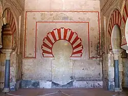 The mosque building was divided between an open courtyard (sahn) to the northwest and an interior prayer hall to the southeast. The mosque was entered via three gates that led into the courtyard and were located on the courtyard's central axes: two lateral gates (to the northeast and southwest) and one on the main central axis of the mosque itself (to the northwest). The latter gate was flanked on one side by a minaret with a square base. This is the earliest evidence of such a minaret being used in the architecture of al-Andalus, as it is older even than the minaret Abd ar-Rahman III later built for the Great Mosque in Córdoba.[12][60] The base of the minaret measures 5 meters per side, and according to historical sources (Al-Maqqari in particular) it originally stood approximately 20 meters high. The mosque's prayer hall was divided by rows of arches into five parallel "naves". Archeological evidence has shown that the arches were double-tiered, emulating the same design feature seen in the Great Mosque of Córdoba.[60] The middle nave, in front of what would have been the mihrab (wall niche symbolizing the direction of prayer), was wider than the other four naves of the mosque.[61]