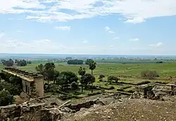 The city covered an almost rectangular area measuring 1.5 km long (roughly from east to west) and 750 wide (roughly from north to south).[50] Its perimeter was protected by a thick stone wall with square bastions. Today only about 10 of the 112 hectares (0.43 sq mi) of the city have been excavated and restored, although this area includes the main palaces.[3] The highest point of the city was at the centre of its northern wall (near the palaces), which is 215 meters above sea level, while the lowest point, to the south and nearer to the river, is 70 meters lower. Most of the site slopes gradually down towards the river except in the central northern zone where there were three distinct levels or terraces built into the hillside, with height differences of 10 meters or more between them.[51] The two upper levels were known as the "Alcázar" (al-Qasr in Arabic).[12] Most of the modern excavations have focused on the Alcázar and its palaces, and these are the areas visitors can access today.[52]