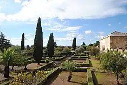 The Upper Garden (Jardín Alto in Spanish) stretches out in front of the Salón Rico and occupies an elevated terrace that is 10 meters higher than the surrounding areas on the east, south, and west. The terrace is artificial, though the builders probably used an existing spur of the hills to start.[72] Its walls are reinforced with rectangular buttresses at regular intervals. On its east side was the Lower Garden and on its west side was the congregational mosque. The latter was reached via a covered path along the terrace wall, and to the south is another large unexcavated garden.[72] The eastern wall of the terrace is aligned with the portico of Bab al-Sudda while its north and south borders are aligned with those of the older Lower Garden to the east. Although it may have been initially intended to have a perfectly square layout, which would have measured 133 by 133 meters, the western side of the garden was extended on top of the Lower Garden, giving it a final width of 153.5 meters instead.[102] The final width corresponds to the base of an equilateral triangle whose summit could be placed at the center of the Salón Rico's façade, similar to the proportions found inside the caliph's reception hall. Felix Arnold suggests that these dimensions are therefore a deliberate part of the design.[102]