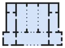 The precise intentions of the hall's design are ambiguous, as the chambers are all connected to each other but in slightly different ways.[35] The central chamber is wider than the others and its entrance from the south is marked by a triple archway instead of a double archway like the other four parallel chambers, which actually made the openings between the columns narrower for the central chamber than for the others. The three middle chambers are also each connected to each other though a wide central door flanked by triple archways with columns, while the two outermost chambers at the sides are connected to the inner chambers through three simple doors. During official receptions, the caliph likely sat in the middle of the back wall of the central chamber.[35] Antonio Vallejo Triano argues that the overall design of the building suggests that the two outermost chambers, along with the southern chamber at the front, formed a U-shaped space around the three central chambers and that the latter formed a privileged space for the caliph's audience. He also adds that there is archeological evidence that the spaces of the two outermost chambers were actually divided into two stories.[73] Felix Arnold, in a slightly different interpretation, suggests that visitors entered the building from the sides and then entered the central chamber by moving from the outermost chambers to the central one, with each wall of doors and archways acting as a "screen" through which they passed closer to the caliph.[71]