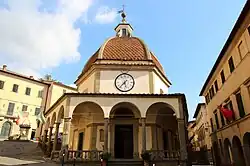 The church was built to a rare hexagonal layout with a rounded dome and facade portico by design of Francesco Folli. The facade has a clock. The Church was dedicated to the Virgin in gratitude for the cessation of the plague. Construction took place from 1657 to 1659. It was deconsecrated in 1705. The main altar has a Madonna and Child with Young St John the Baptist, also called the Madonna del Canto, painted by a follower of Filippino Lippi.[1]