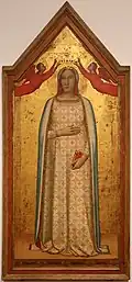 Notable examples include works by Taddeo Gaddi, Bernardo Daddi and Nardo di Cione, but the fresco by Piero della Francesca in the Museum of Monterchi, in the province of Arezzo, is considered the most famous one. The Madonna was portrayed standing, alone, often with a closed book on her stomach, an allusion to the Incarnate Word. These works were associated with the devotions of pregnant women, praying for a safe delivery.[1]