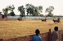 Madura is famous for its bull-racing competition (called karapan sapi), where a jockey, usually a young boy, rides a simple wooden sled pulled by a pair of bulls over a course of about 100 meters in ten to fifteen seconds.