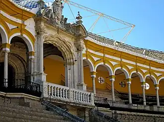 Bullfights in Seville during the Feria de Abril are the most important event of the city's bullfighting calendar. The regular season goes from March or April (depending on the Semana Santa dates) until late September.[1] Every year the Real Maestranza commissions a painter to produce a poster announcing the bullfighting season in its Royal Bullring.[2]