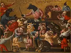 The persons and animals in the compositions engage in disorganised actions and reactions. The compositions are full of absurd and grotesque elements and it is often difficult to make out what exactly is going on.[3] The master’s raucous style appears to constitute some form of 'moral zoology'. The absurd characters are possibly intended to show the madness of the human condition, and the vanity and ridiculousness of life.[2]