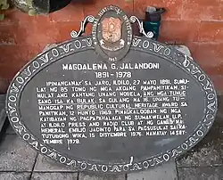 Magdalena Gonzaga Jalandoni (May 27, 1891, in Jaro, Iloilo – September 14, 1978, in Jaro)[1] was a Filipino novelist, playwright, short story writer, poet, sculptor and painter. She is now remembered as one of the most prolific Filipino writers in the Hiligaynon language. Hailing from Western Visayas, her works are said to have left permanent and significant milestones in Philippine literature.