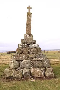 A memorial monument to Wall is situated approximately 1 mile (1.6 km) west of Dunning.[2] The stone monument is approximately 20 feet (6 m) tall and resembles a cairn.[1] It is topped by a stone cross and bears the painted inscription "Maggie Wall burnt here 1657 as a witch".[1][2]